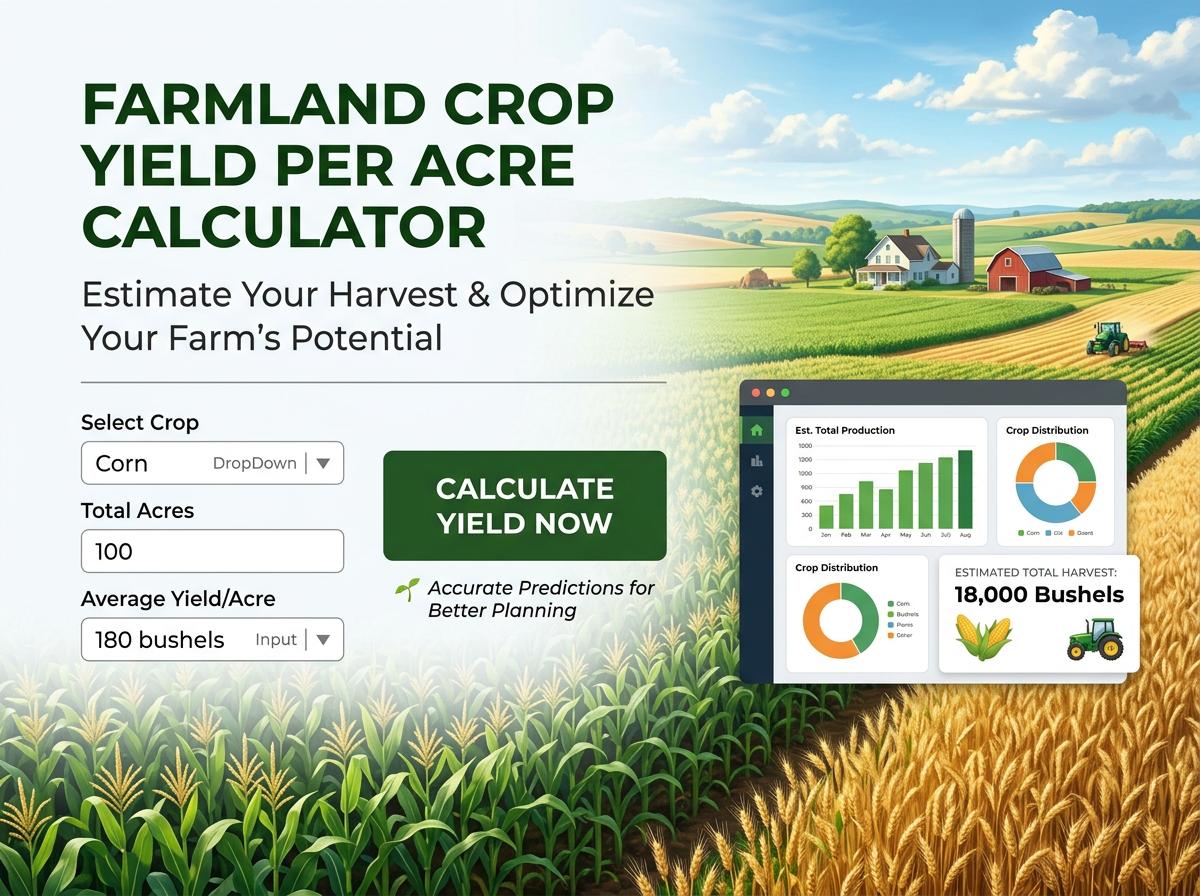 Maximize your harvest with our accurate Farmland Crop Yield per Acre Calculator. Instantly estimate total crop production, optimize your agricultural planning, and forecast farm profitability. A fast, free, and essential tool for farmers, agronomists, and landowners preparing for the growing season.