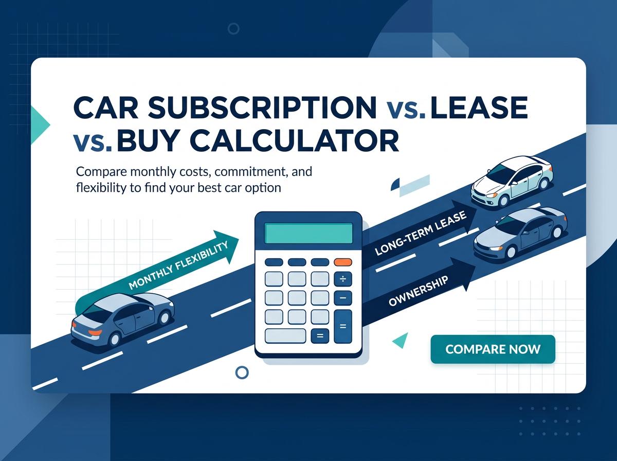 Use our free Car Subscription vs. Lease / Buy Calculator to compare the true costs of your next vehicle. Easily evaluate total expenses, including monthly payments, down payments, insurance, maintenance, and hidden fees, to find the most cost-effective and flexible option for your lifestyle and budget.