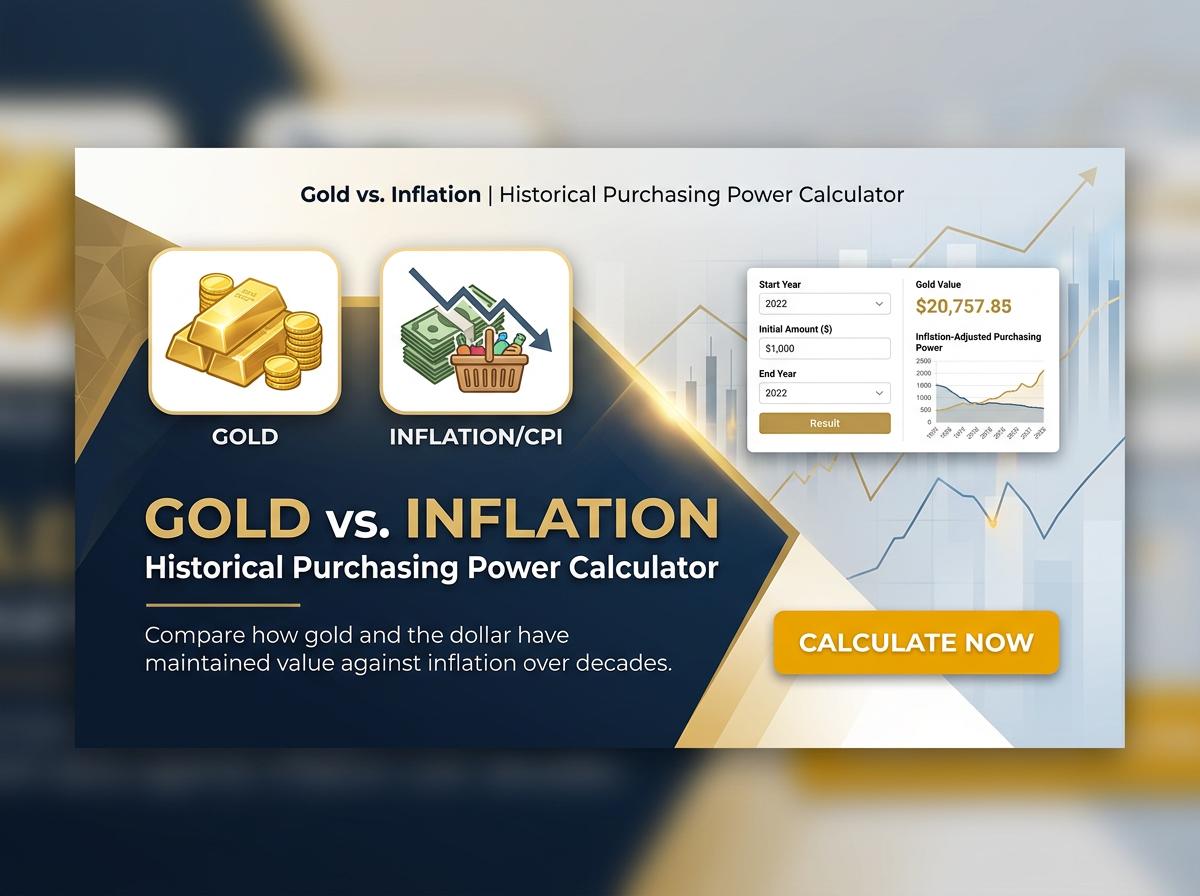 Track gold's true value over time with our Gold vs. Inflation Historical Purchasing Power Calculator. Compare historical gold prices against inflation rates to analyze real returns, currency depreciation, and long-term wealth preservation. Enter your dates and amounts to see how effectively gold protects your buying power. Try the free calculator today!